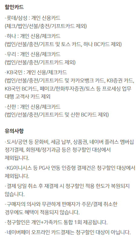 네이버페이 온라인 가맹점에서 신용카드 결제시 적용되지만 일부 가맹점에서는 불가하기도 하니 참고하셔야 합니다.