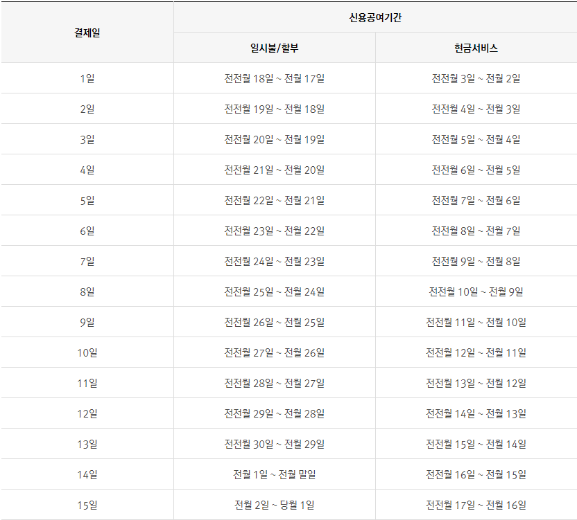 다만 카드 결제 14일을 선택하실 경우 전월의 1일~말일까지의 이용금액이 청구됩니다.