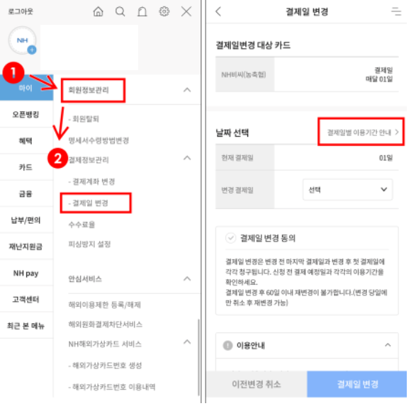 [My NH] > [결제서비스] 칸의 [결제일변경]으로 순서대로 들어가줍니다.