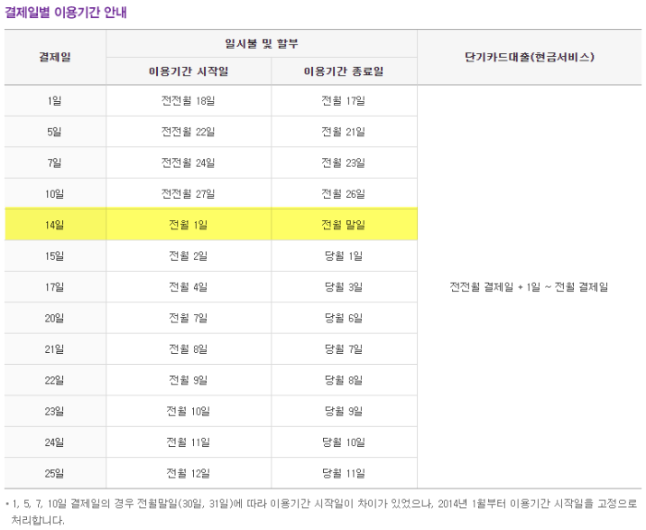 다만 카드 결제 14일을 선택하실 경우 전월의 1일~말일까지의 이용금액이 청구됩니다.
