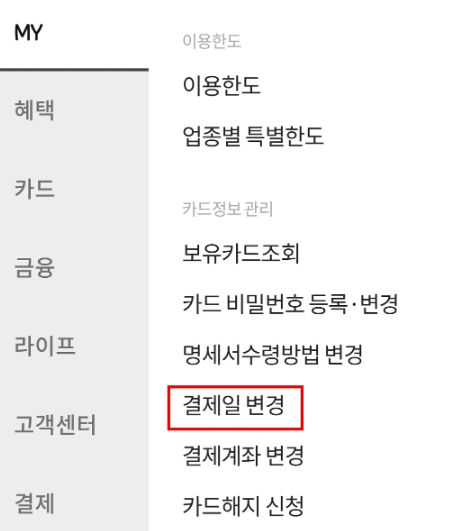이후 [My] > [카드정보관리] 칸의 [결제일변경]으로 순서대로 들어가줍니다.
