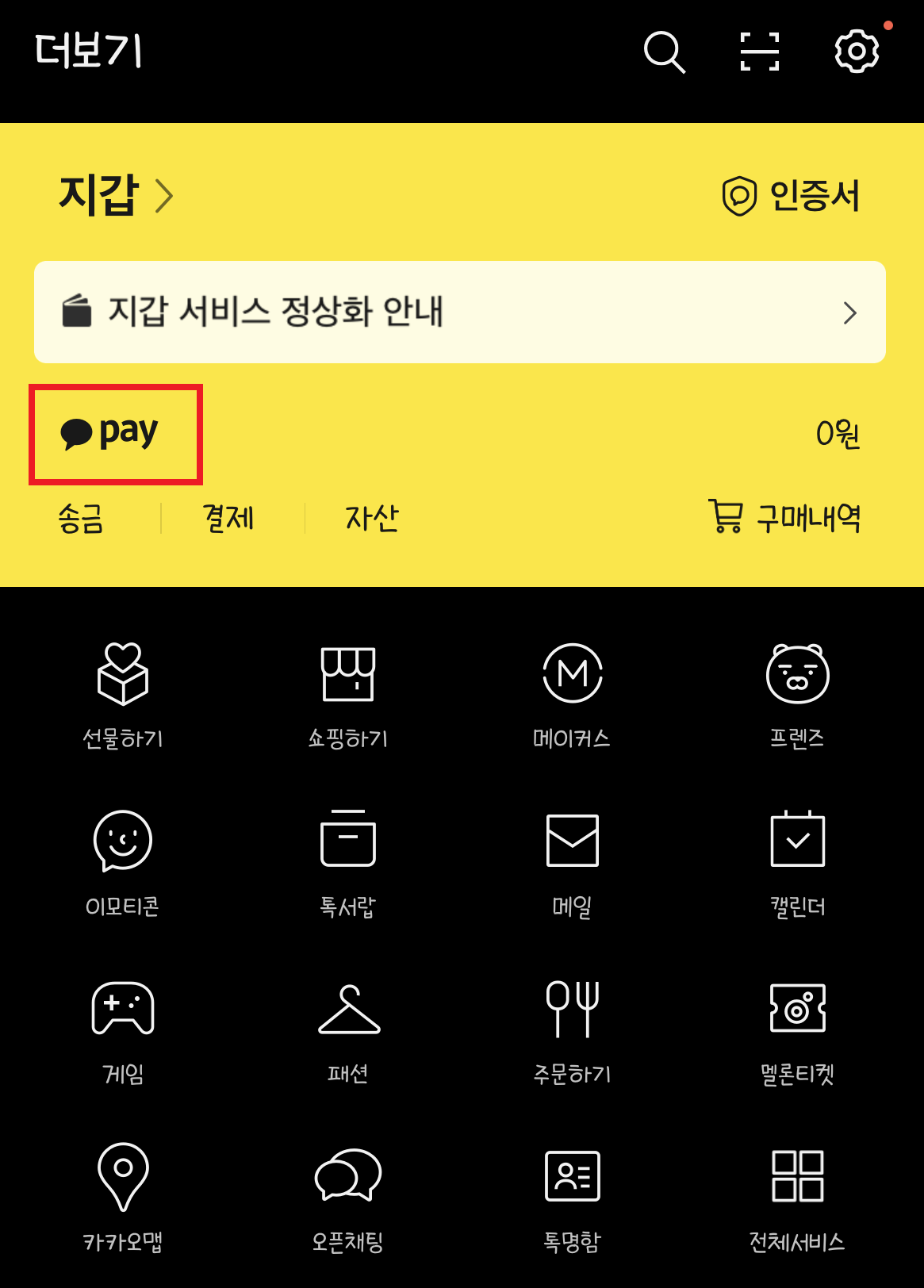 우선 하단에서 가장 오른쪽 전체 메뉴를 누르신 다음, [pay]를 눌러주세요.