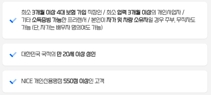 - 대출대상: 자가 또는 차량 소유자로 만 20세 이상이어야 하며, 나이스 개인신용평점 550점 이상.