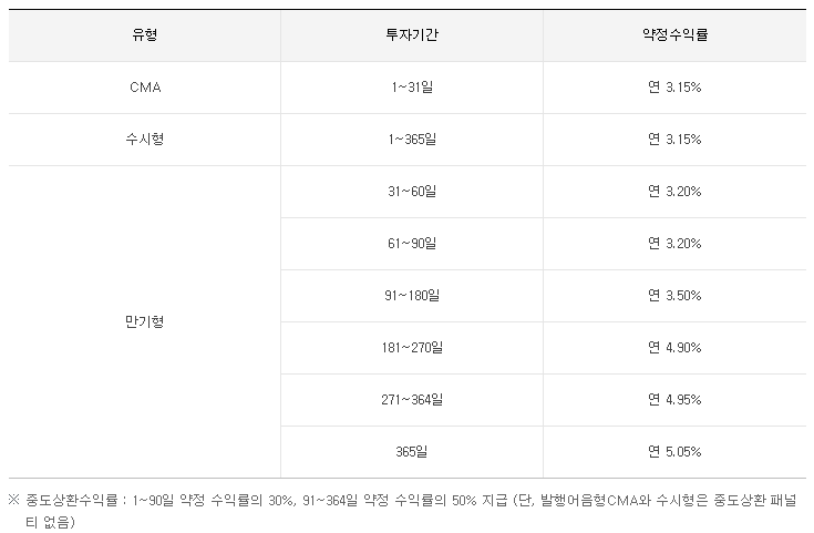 우선 첫번째 개인 대상 발행어음은 미래에셋CMA(미래에셋증권CMA), 수시형, 만기형으로 나뉩니다. 약정수익률은 여러분들이 가져가실 수 있는 이자, 즉 금리라고 보시면 됩니다.