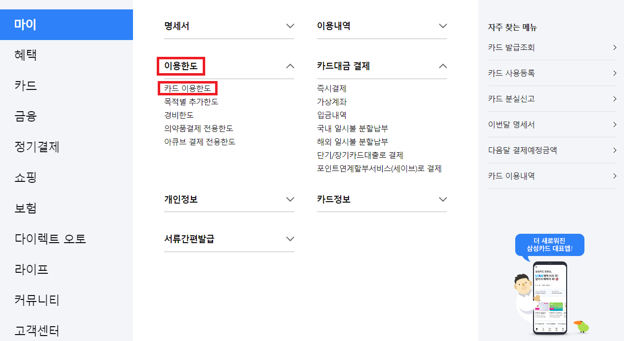 한마디로 삼성카드 한도상향심사 신청을 하는 거죠.