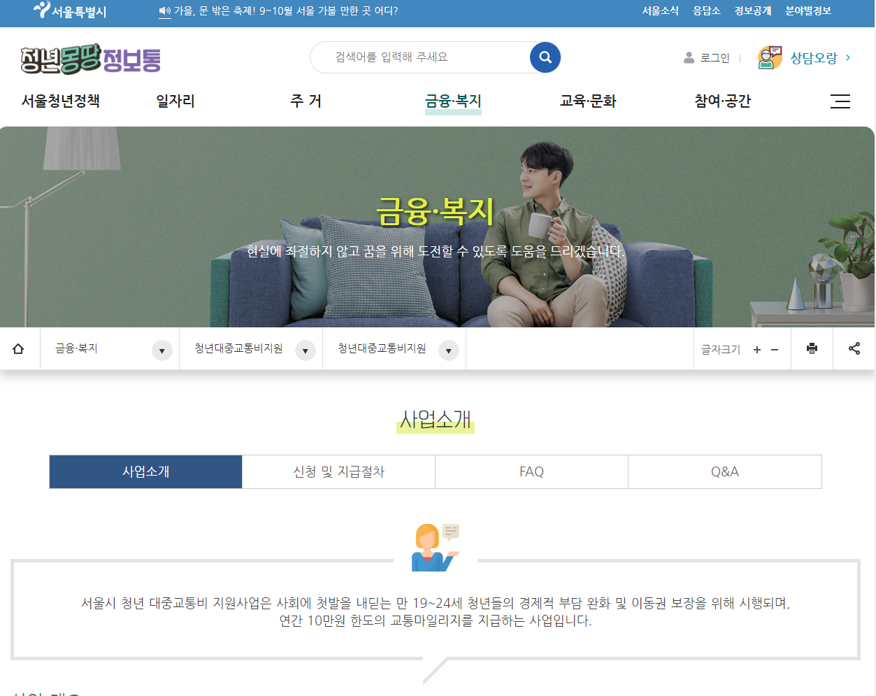사업소개 > 청년대중교통비지원 > 청년대중교통비지원 > 금융·복지 > 청년몽땅정보통