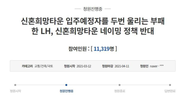 그래서 네이밍에 대한 문제가 등장하였고 얼마전 국민청원에 LH가 주도하는 신혼희망타운 네이밍(줄여서 신희타 네이밍)을 반대한다는 청원이 등장하였습니다. 해당 청원은 1만 3천여명의 동의를 넘어서면서 문제가 지속적으로 제기되었습니다.