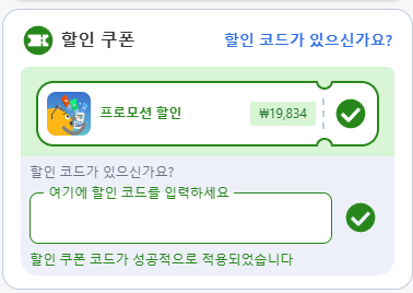 클릭했을 때 할인 쿠폰 코드가 성공적으로 적용되었다는 알람이 떴다면 제대로 된 것입니다.