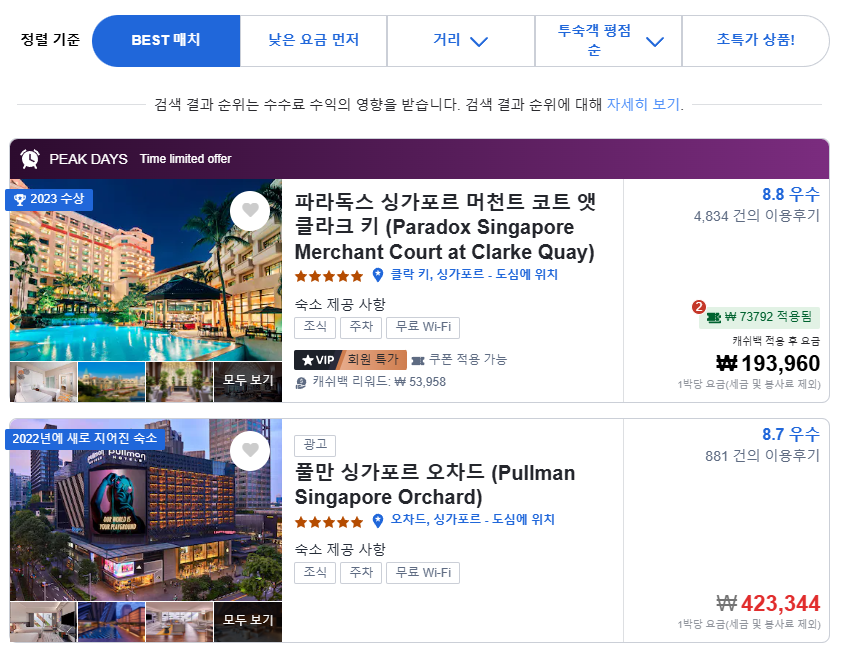 저는 싱가포르에 갈 일이 있어 싱가포르에서 원하는 숙소를 골라보았습니다.