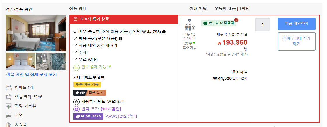예약할 수 있는 객실을 확인할 수 있습니다. 그 중에서 원하는 것을 선택하여 지금 예약하기를 클릭하여 결제 창으로 넘어갑니다.