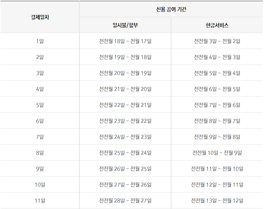 또한 월별 신용공여기간에 대한 자세한 세부 내용은 여러분들께서 받으시는 이용대금명세서에 나와있으니 꼼꼼하게 읽어보시기 바랍니다.