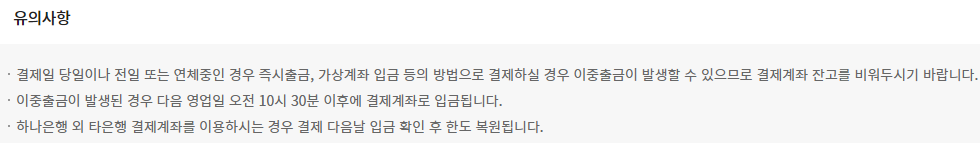 뿐만 아니라 금융결제원 은행을 이용하시는 경우 2-3일 간격을 두고 출금됩니다.