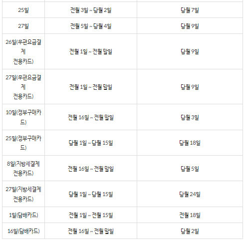 추후에 롯데카드 결제일별 사용기간, 신한카드 결제 일별 이용기간, 우리카드 25일 결제일 등에 대해 포스팅하도록 하겠습니다.