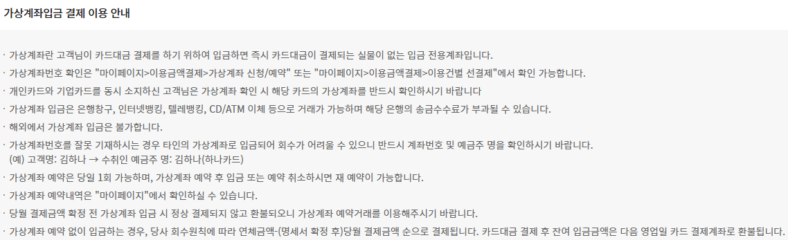 | 가상계좌 예약을 통한 선결제 | 하나은행(구외환 포함), KB국민은행, NH농협은행 : 결제일 1일 전 08:00 ~ 23:30 (365일 거래 가능 / 결제일 당일 당월대금, 연체 중 예약불가) |