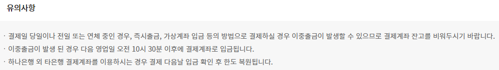 만일 하나은행의 업무 사정이나 어떤 은행의 계좌를 사용하시느냐에 따라 은행 영업시간인 오후 4시 이후 결제 계좌에 입금하게 되면, 연체료가 발생할 수 있습니다.