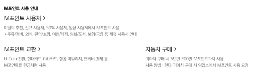 M포인트 사용처로 주유/정비, 외식, 편의/쇼핑, 여행/레저/ 보험/금융 등 M포인트 제휴몰 사용처에서 사용할 수 있고 M포인트 교환도 가능한데 H-Coin전환, 현대카드 GIFE카드, 항공 마일지, 연회비 결제 등 M포인트를 현금처럼 사용이 가능합니다.